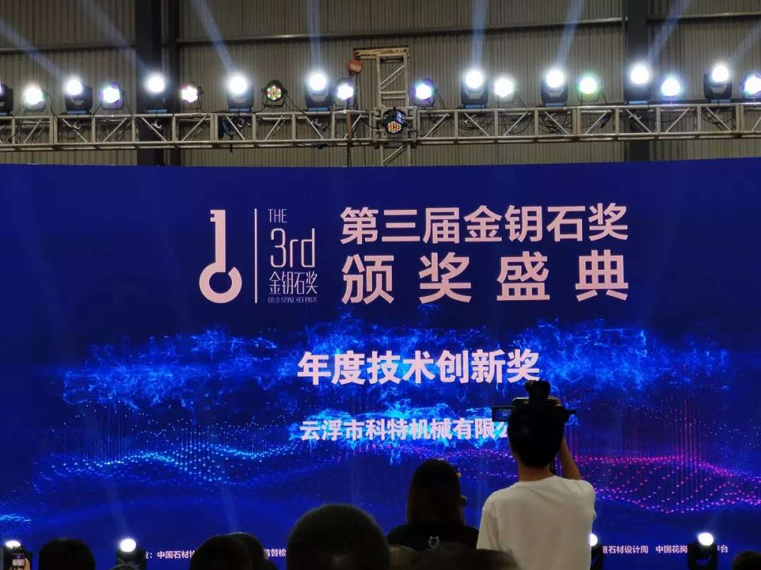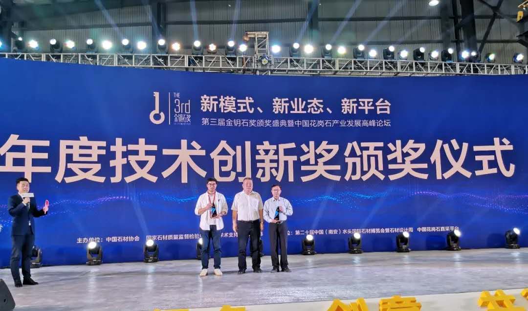2019年11月8日下午,年度行業(yè)盛會“第三屆金鑰石獎頒獎盛典”在中國水頭石材產(chǎn)業(yè)展示運營中心隆重舉行?铺貦C械憑借行業(yè)首創(chuàng)、自主研發(fā)的“石材信息化3P解決方案”,繼【中國建材行業(yè)技術(shù)革新一等獎】、【中國石材行業(yè)技術(shù)革新一等獎】后,又獲殊榮,摘取【第三屆金鑰石—年度技術(shù)創(chuàng)新獎】。