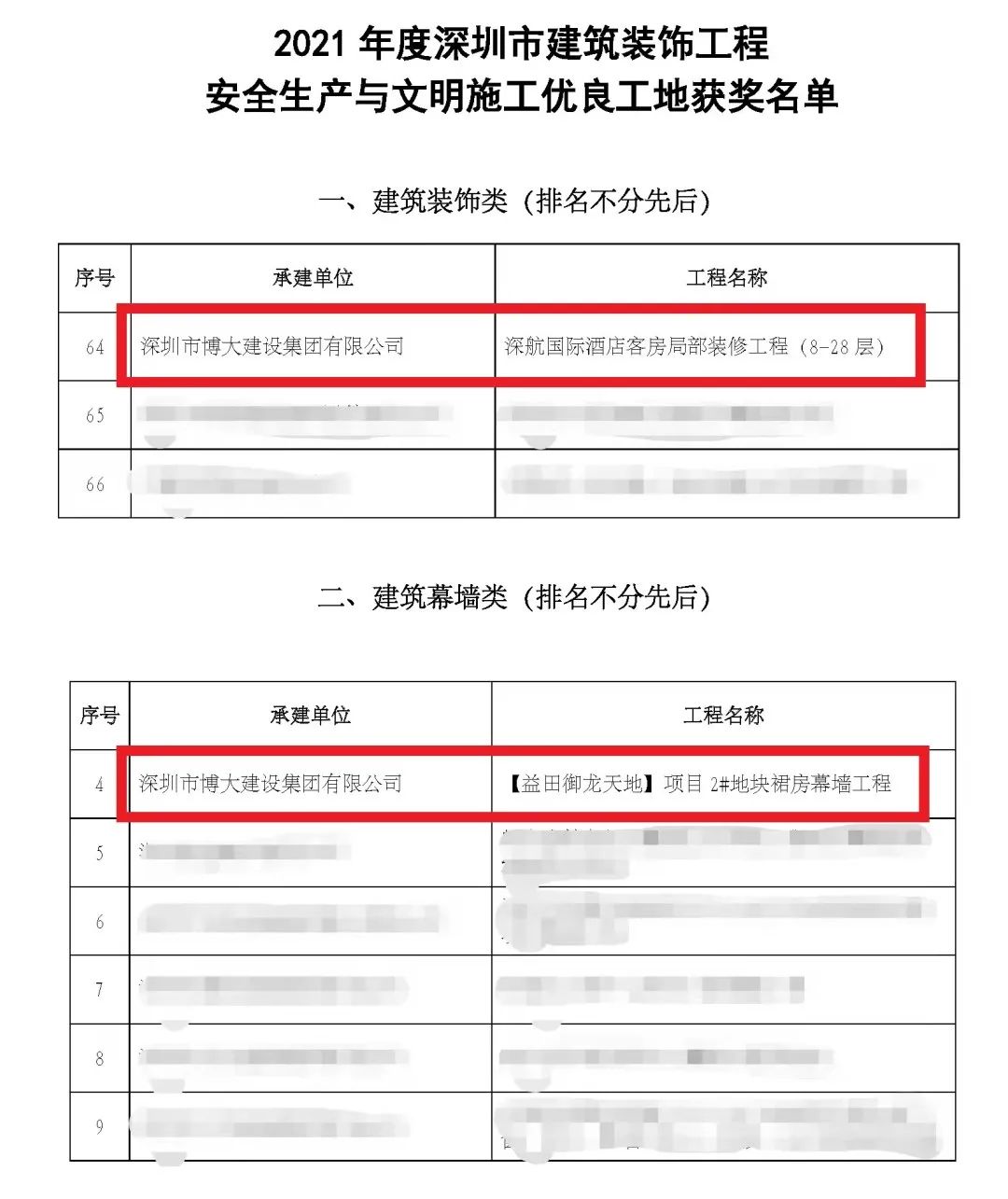 博大建設(shè)集團榮獲兩項深圳市建筑裝飾工程安全生產(chǎn)與文明施工優(yōu)良工地