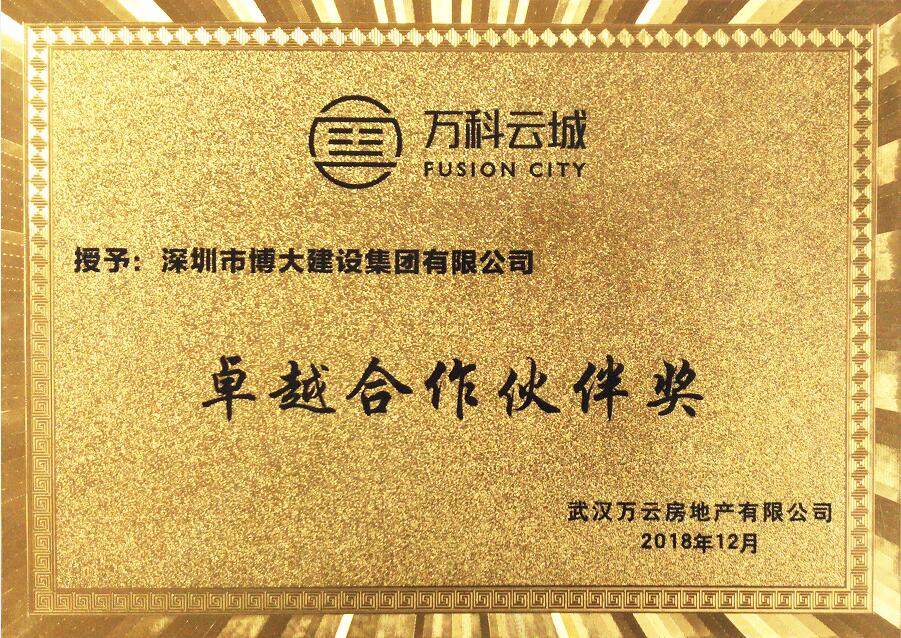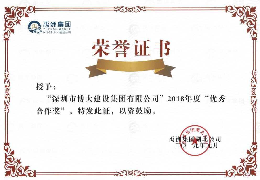 博大建設(shè)集團(tuán)承建了禹洲集團(tuán)湖北公司武漢賽洛城六期的精裝房工程,在武漢百盤維權(quán)的背景下,博大負(fù)責(zé)的精裝房一次性交房率達(dá)到98.41%,且工程質(zhì)量優(yōu)秀,幫助客戶成功避免了因交期、裝修質(zhì)量而造成的消費者維權(quán)風(fēng)波。博大的綜合實力和用心服務(wù)贏得禹洲集團(tuán)湖北公司的高度認(rèn)可,榮獲2018年度優(yōu)秀合作獎。