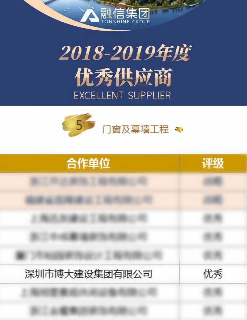 博大建設(shè)集團(tuán)在2018-2019年度成績(jī)突出,榮獲融信集團(tuán)頒發(fā)的門窗及幕墻工程“優(yōu)秀供應(yīng)商”稱號(hào)。融信集團(tuán)創(chuàng)立于2003年,總部位于上海,是中國(guó)房企20強(qiáng)。