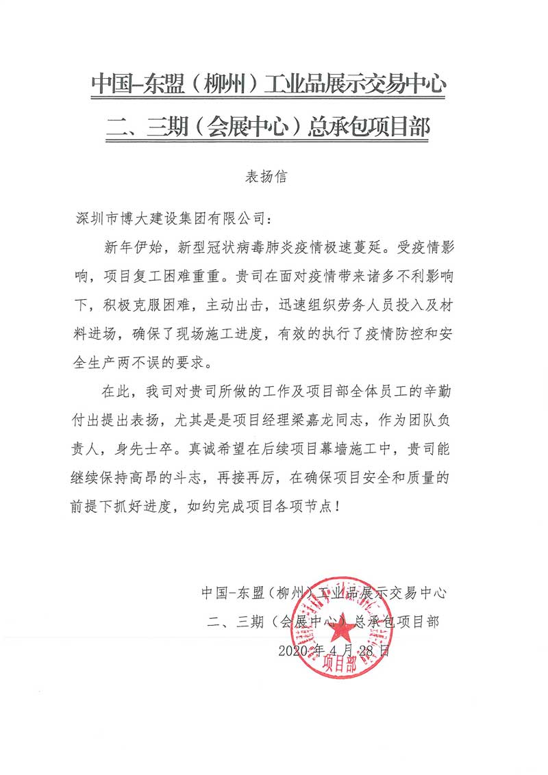 博大建設(shè)集團(tuán)在中國(guó)-東盟(柳州)工業(yè)品展示交易中心二、三期(會(huì)展中心)項(xiàng)目中,積極克服疫情造成的困難,主動(dòng)出擊,確保了現(xiàn)場(chǎng)施工進(jìn)度,有效的執(zhí)行了疫情防控和安全生產(chǎn)兩不誤的要求,獲得客戶表揚(yáng)。