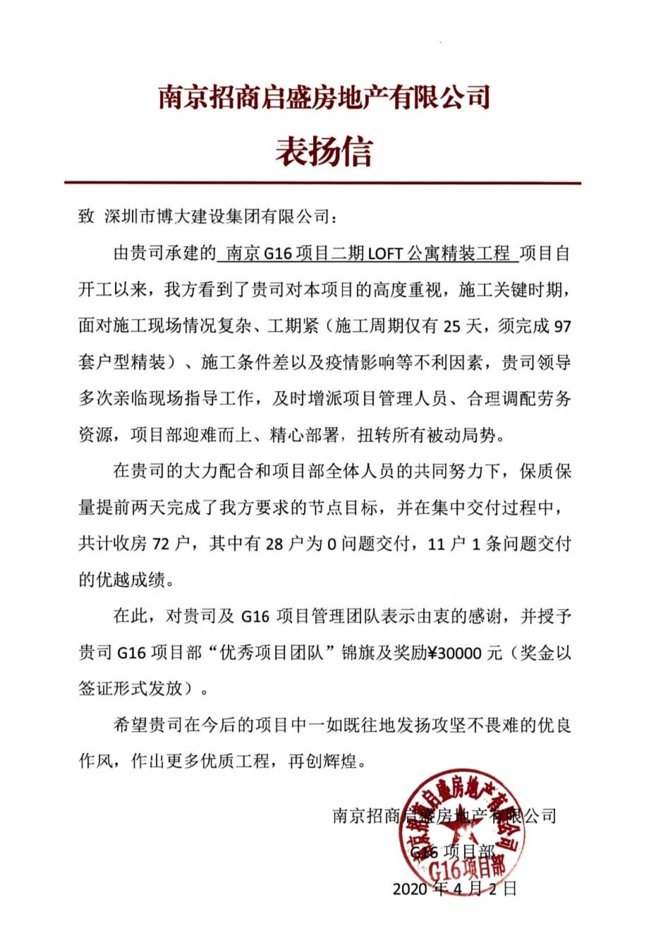 博大建設(shè)集團(tuán)在南京G16項(xiàng)目二期LOFT公寓精裝工程中,迎難而上,積極解決工期問題,以高標(biāo)準(zhǔn)的質(zhì)量,提前完成節(jié)點(diǎn)目標(biāo),受到客戶的表揚(yáng),并榮獲“優(yōu)秀項(xiàng)目團(tuán)隊(duì)”榮譽(yù)。
