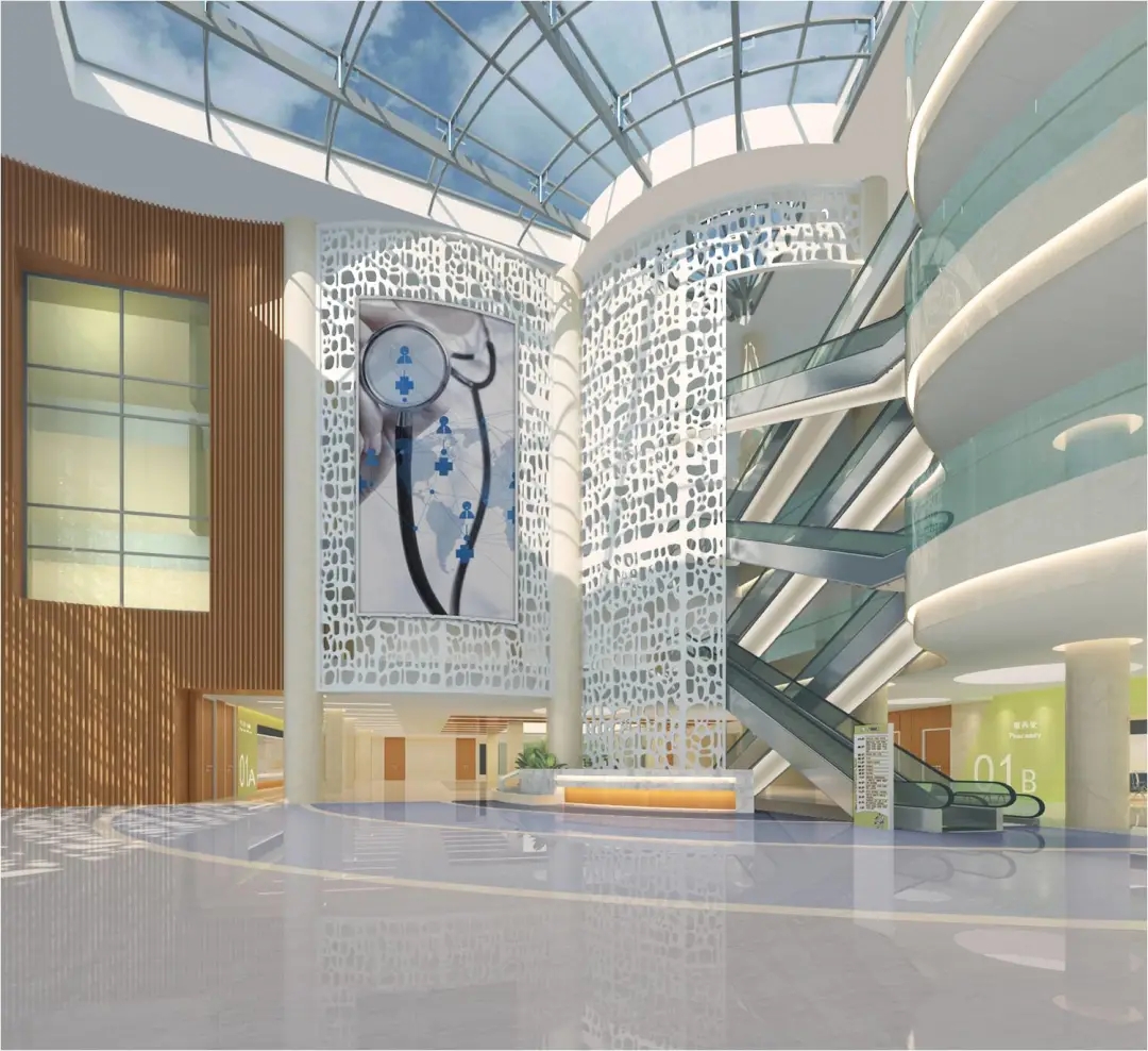 住院大廳天棚采用大面積玻璃采光頂,節(jié)約采光成本的同時(shí)營(yíng)造廣闊的視覺空間。墻面采用仿石材瓷磚,與石材地面銜接,穿插氟碳烤漆鋼板柱子,通過對(duì)點(diǎn)線面的梳理,凸顯簡(jiǎn)約、大氣、通透、現(xiàn)代化的視覺美感。