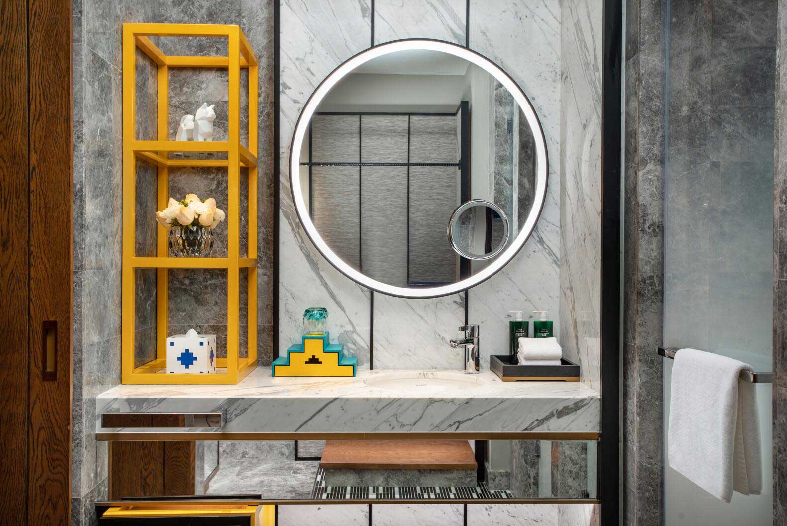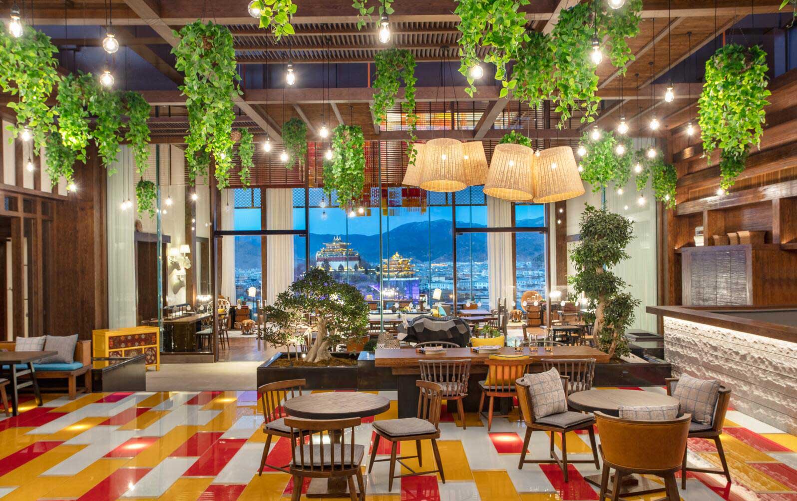 酒店大堂大氣而不失現(xiàn)代藝術(shù)美感,走進(jìn)其間,隨處可見極具當(dāng)?shù)仫L(fēng)格的藝術(shù)品與裝飾,隱約可見香巴拉的縮影。頂部設(shè)計(jì)對光影的巧妙運(yùn)用可謂巧奪天工,自然光線透過鏤空屋頂灑落下來,與地面交相輝映,且在高原寒冷地區(qū)用特色小景、綠植裝點(diǎn),讓人如同置身熱帶溫室,光影交錯(cuò)間,營造出“眼有星河,心藏日月”的詩意畫面。