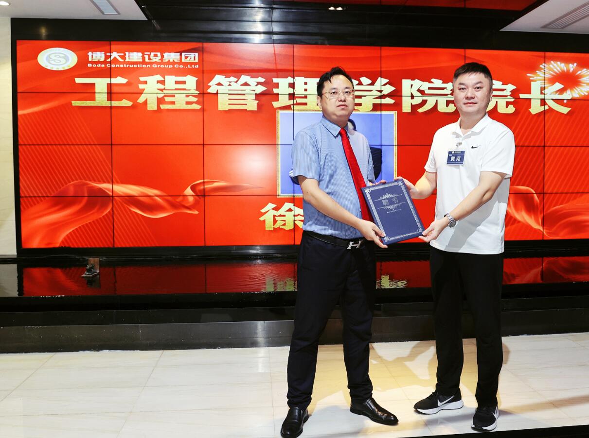 14日上午,培訓(xùn)正式開始前,博大鐵軍大學(xué)隆重舉行工程管理學(xué)院、研發(fā)技術(shù)學(xué)院兩個(gè)院長的任命儀式。任命集團(tuán)高級(jí)副總裁、裝飾機(jī)電中心總經(jīng)理徐朝華為工程管理學(xué)院院長,任命幕墻中心總工程師李立強(qiáng)為研發(fā)技術(shù)學(xué)院院長。
